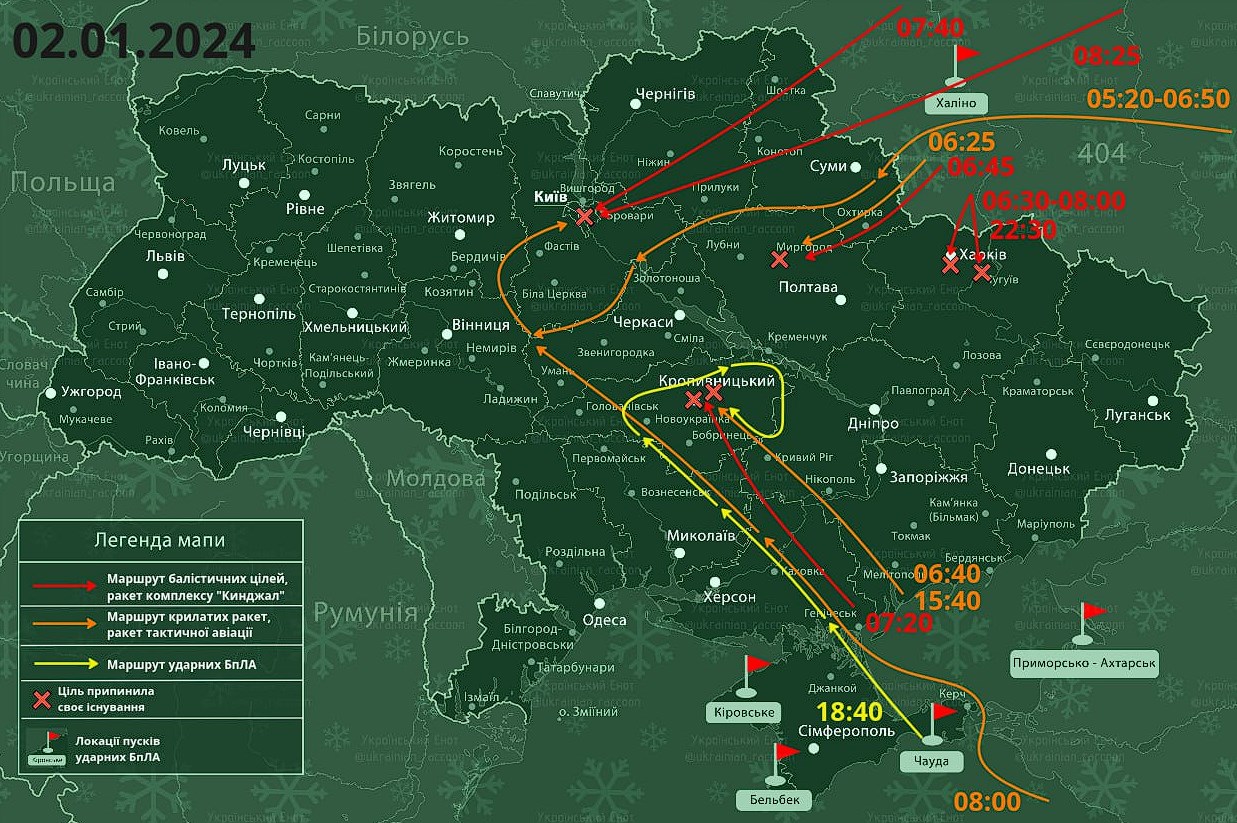 Карта маршрутов враждебных целей за 2 января 2024 года