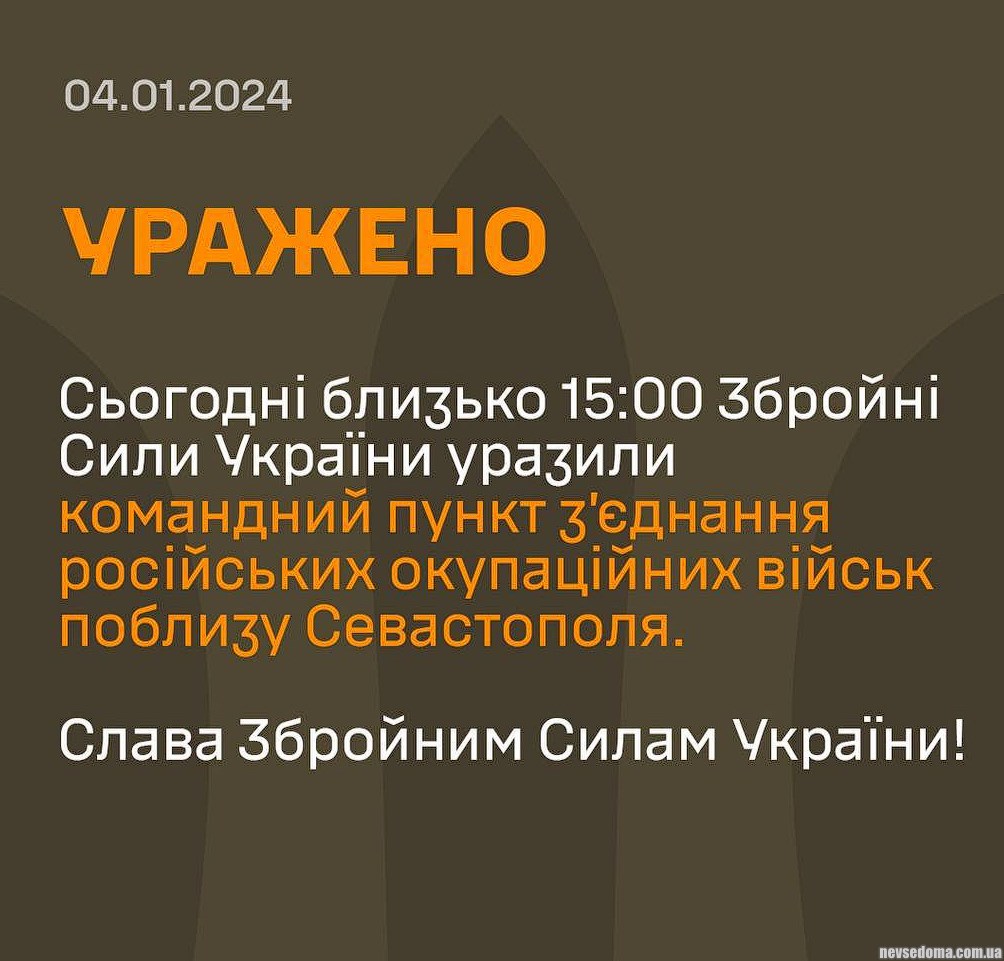 - Украинский StratCom сообщает, что украинские войска нанесли удар по командному пункту российских войск под Севастополем в Крыму.