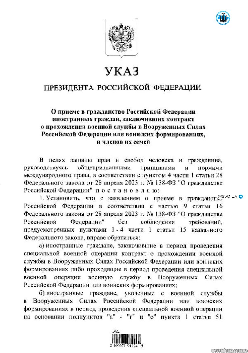 - путин утвердил указ о предоставлении гражданства рф иностранным наемникам, участвующим в войне в Украине