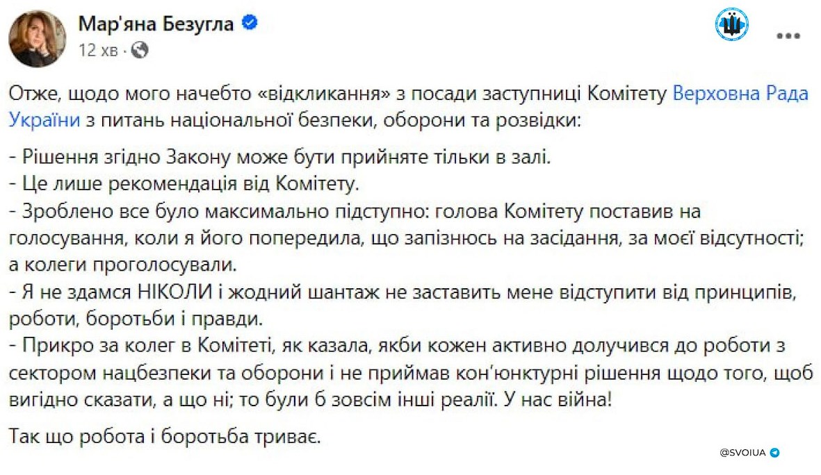 - Безуглую отозвали с должности заместителя председателя комитета по нацбезопасности — NV