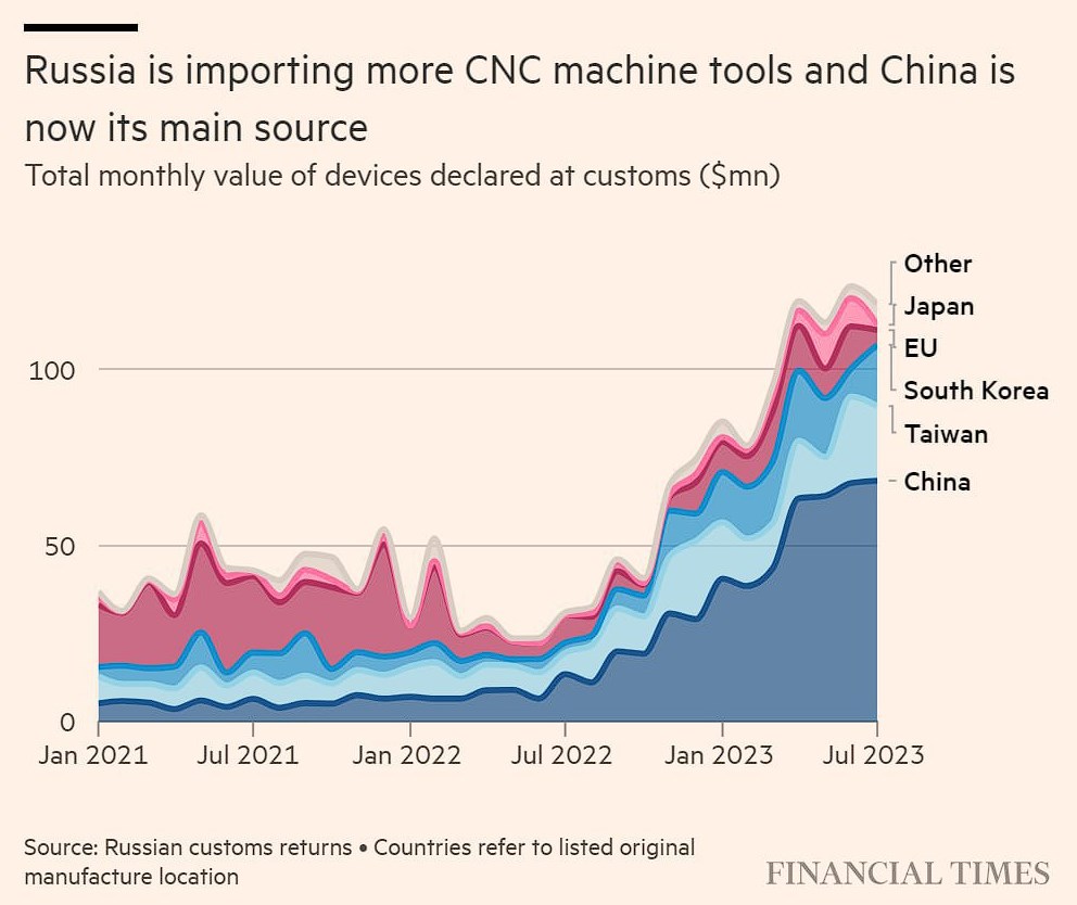 Судя по российским таможенным декларациям, в июле китайские компании поставили в РФ оборудования с числовым программным управлением на сумму $68 млн, тогда как в феврале 2022 года эта цифра составляла $6,5 млн.