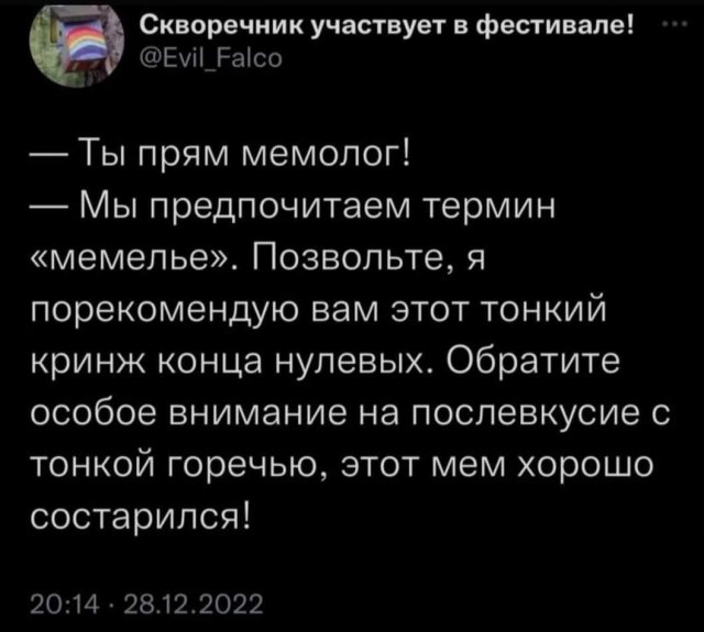 Лучшие шутки и мемы из Сети. Выпуск 459 Категория: Лучшие шутки и мемы из Сети, PEGI 16 3 января 2023 Предыдущая страница 1 2 Следующая страница Предыдущая подборка +5 подборка, мемы, шутки, советы