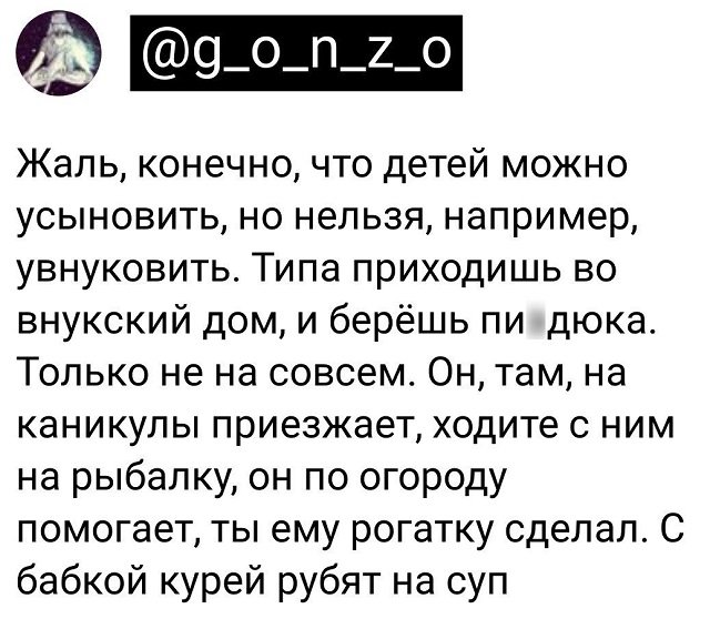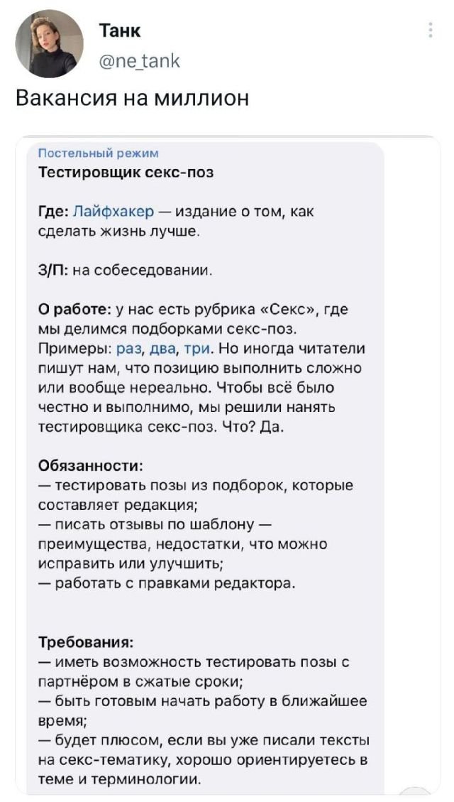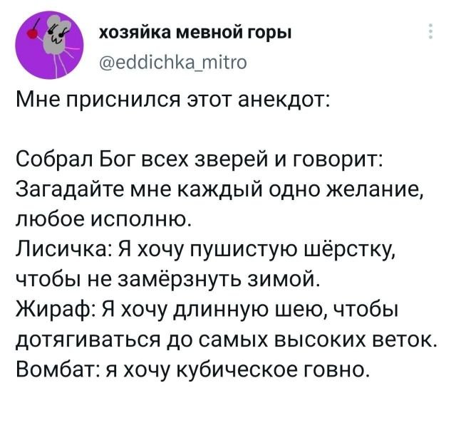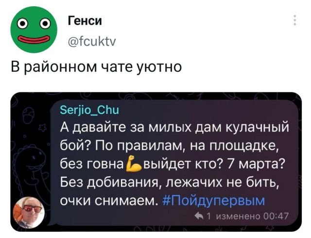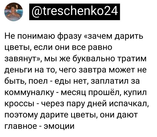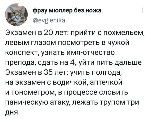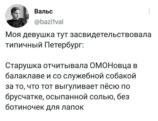 Подборка забавных твитов обо всем. Выпуск 566 Категория: Подборка забавных твитов обо всем, PEGI 16 6 марта 2023 Предыдущая страница 1 2 Следующая страница Предыдущая подборка +4 интернет, твиты, короткие сообщения, Приколы, мысли