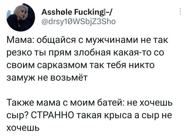 Подборка забавных твитов обо всем. Выпуск 575 Категория: Подборка забавных твитов обо всем, PEGI 16 13 апреля 2023 Предыдущая страница 1 2 Следующая страница Предыдущая подборка +4 интернет, твиты, короткие сообщения, прикол, мысли