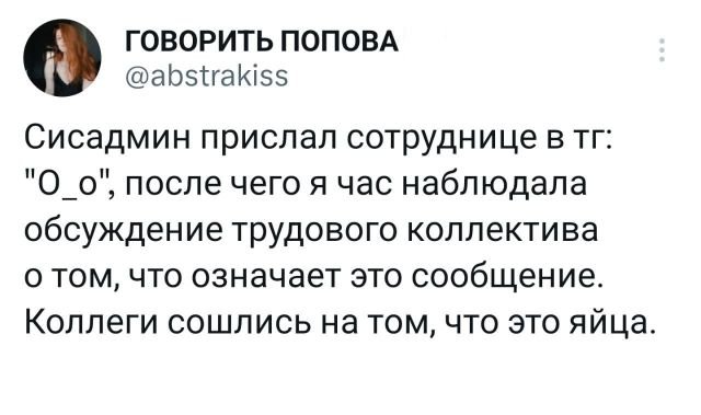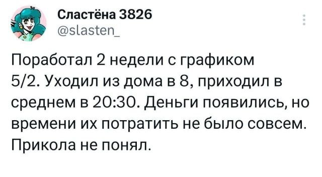 Подборка забавных твитов обо всем. Выпуск 587 Категория: Подборка забавных твитов обо всем, PEGI 16 12 июня 2023 Предыдущая страница 1 2 3 Следующая страница Предыдущая подборка +1 интернет, твиты, короткие сообщения, прикол, мысли