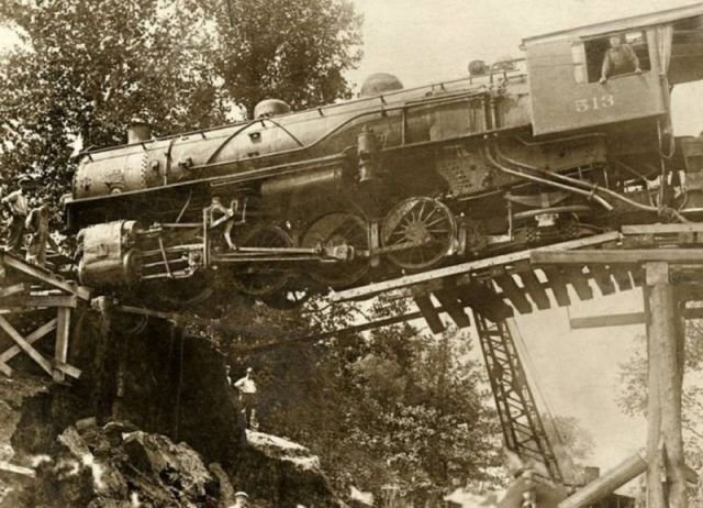 Машиніст оглядає міст, що рухнув під паровозом. Канада, 1926 рік.