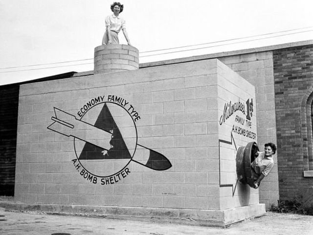 Демонстрація підземного бомбосховища економ-класу, яке могло вмістити від 8 до 12 осіб, США, 1958 рік. Заявлялося, що це бомбосховище могло витримати падіння 20-мегатонної бомби в тротиловому еквіваленті.