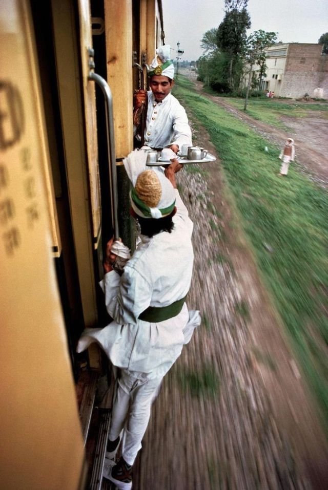 Провідники передають чай для сніданку з одного вагона до іншого, Пакистан, 1983 рік.