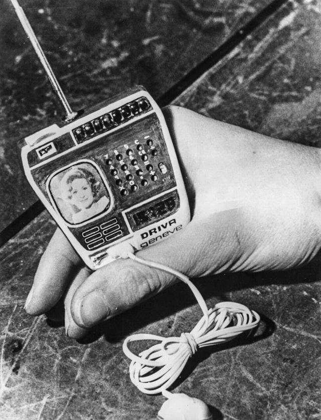 Годинник компанії Driva Geneve зі Швейцарії, з телевізором, радіо та калькулятором, 1976 рік. Акумулятор доводилося носити у кишені.