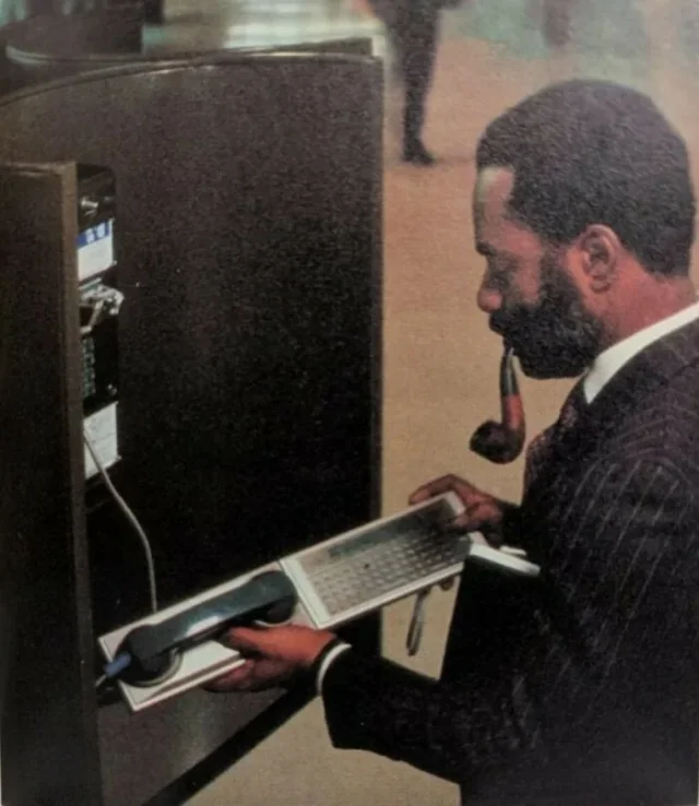 Чоловік перевіряє свою електронну пошту на телефоні, використовуючи комутований доступ через модем Panasonic RL-P4001 Acoustic Coupler, підключений до портативного комп'ютера Panasonic RL-H1400 HHC, початок 1980-х