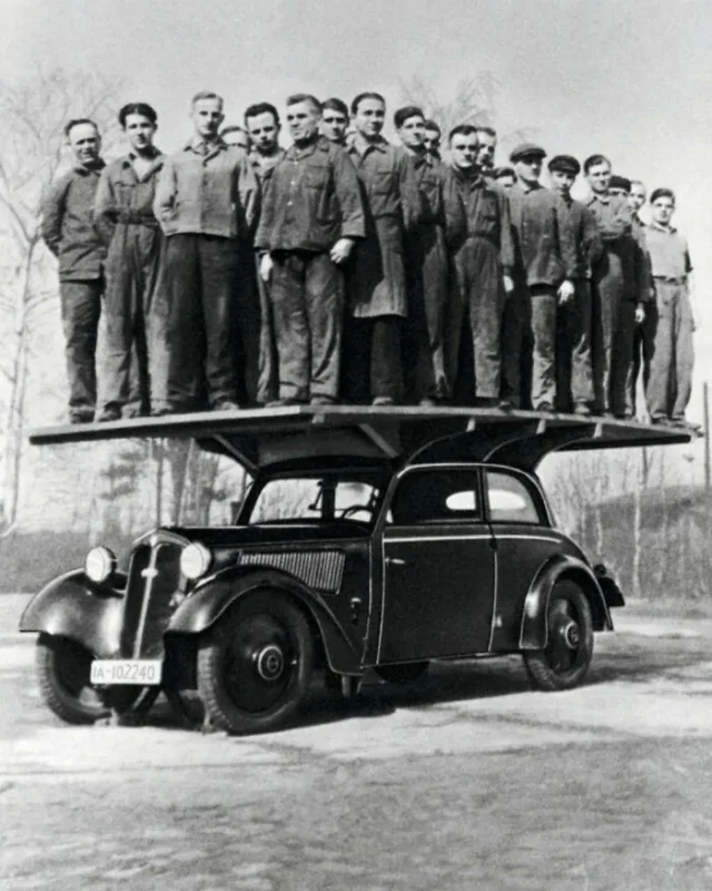 Робочі демонструють міцність кузова Audi 920 1938 року випуску ![]()
