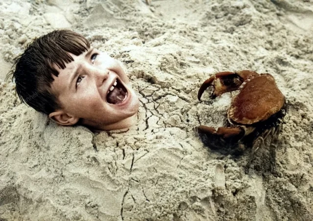 Краб атакує закопаного у пісок хлопчика, 1959 рік.