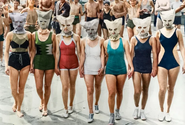 Сім жінок у купальниках. На Коні-Айленд відбувся конкурс краси, в якому враховувалося лише одне тіло. Особи конкурсанток були приховані масками. США, Коні-Айленд, 1935 рік.