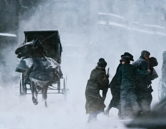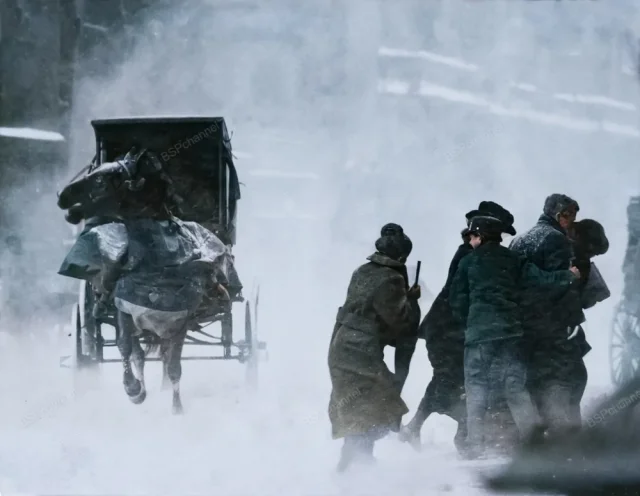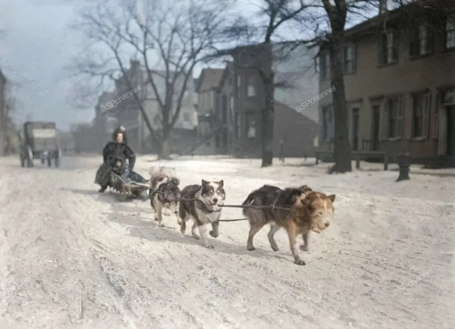 Хаски тягнуть сани з дорослою та дитиною, що їдуть засніженою житловою вулицею, Чикаго, штат Іллінойс, близько 1904 року.