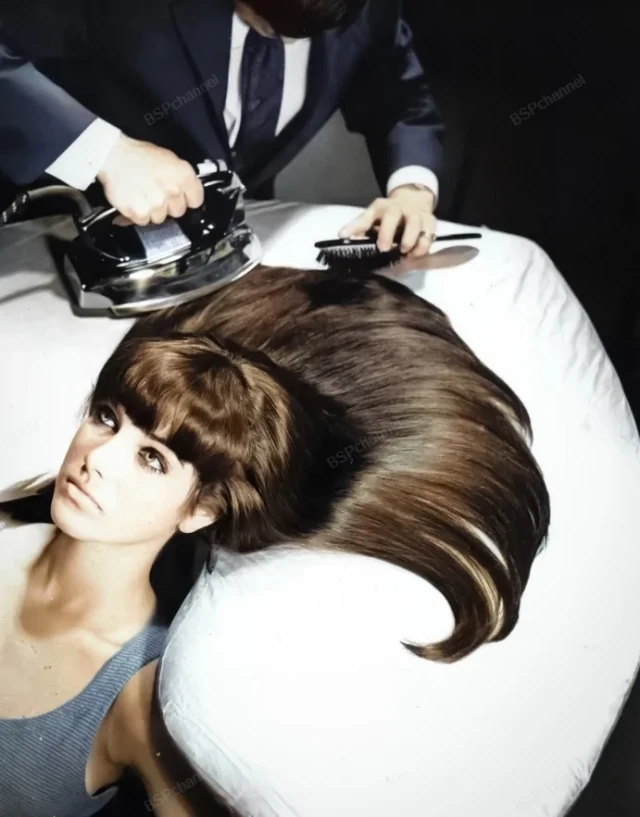 Перукар розчісує і гладить волосся моделі на дошці, призначеної для прасування волосся. Нью-Йорк, 1965 рік.