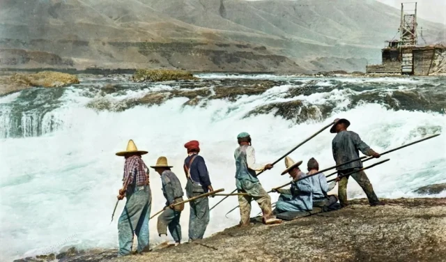 Рибалки озброєні списами, ловлять лосося біля водоспаду Селіло. Річка Колумбія на кордоні штатів Орегон та Вашингтон, США, близько 1920 року.