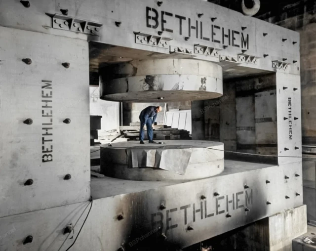 Огляд обладнання для кування великого магніту. Магніт використовувався у циклотроні, 1948 рік.
