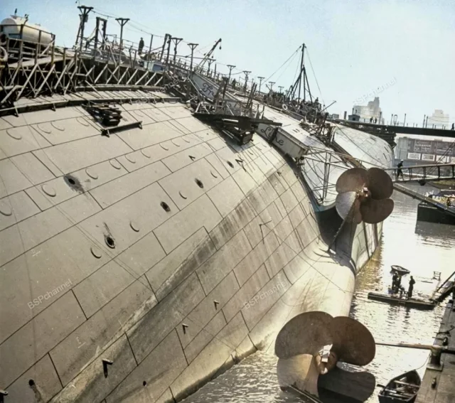Французький трансатлантичний лайнер Normandie з піднятими з води гребними гвинтами, 1942 рік.