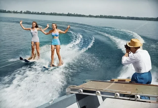 Чоловік фотографує двох жінок, що катаються на водних лижах, на озері Елоїз. Флорида, США, 1950-ті.