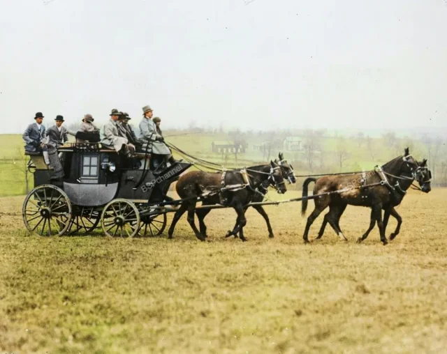 Дев'ять людей у диліжансі, запряженому чотирма кіньми. США, Вірджинія, 1926 рік.