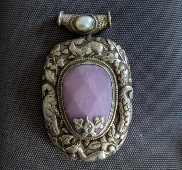 Це срібний тибетський кулон з перлами і гранованим каменем, можливо, фіолетовим нефритом".