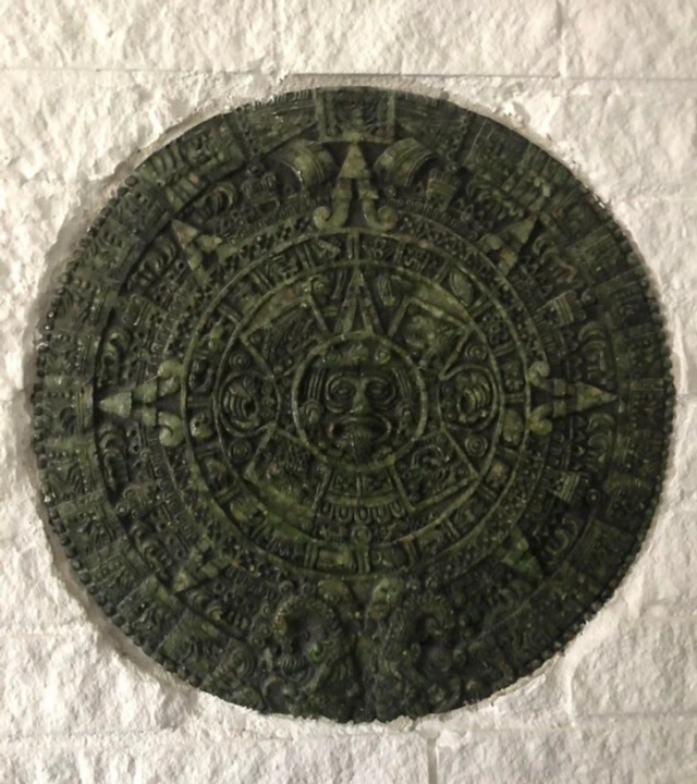Це ацтекський календар. У мене є такий самий. Він виготовлений із зеленого нефриту та вставлений у дерев'яну раму.