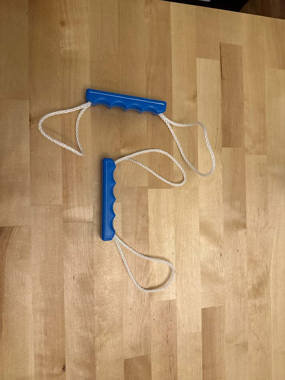 «Сині пластикові ручки з борозенками для пальців та білими пластиковими мотузковими петлями»