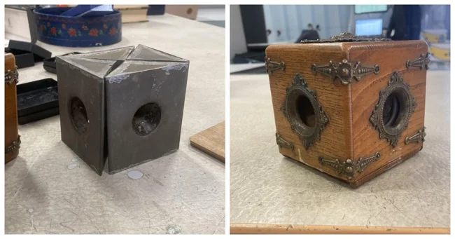 7. Маленька дерев'яна квадратна скринька з металевими прикрасами та чотирма порожніми металевими контейнерами всередині з отворами.