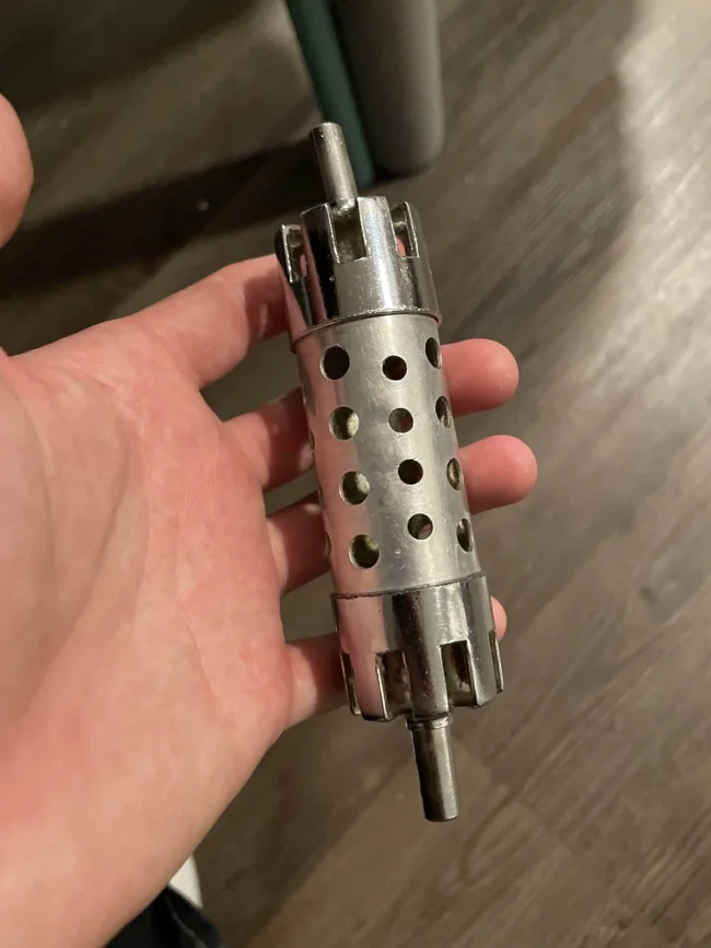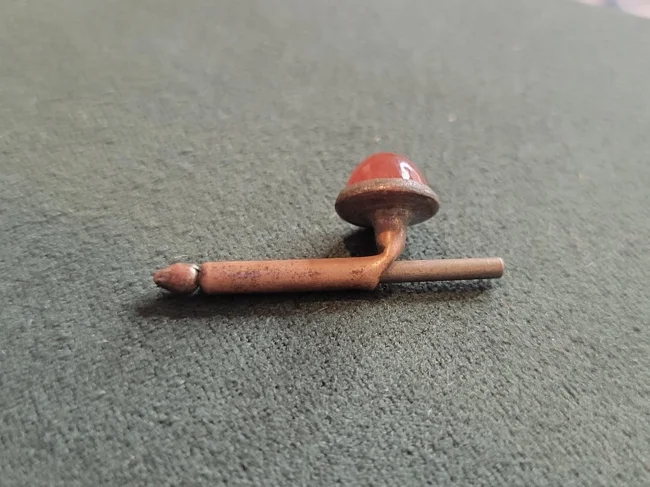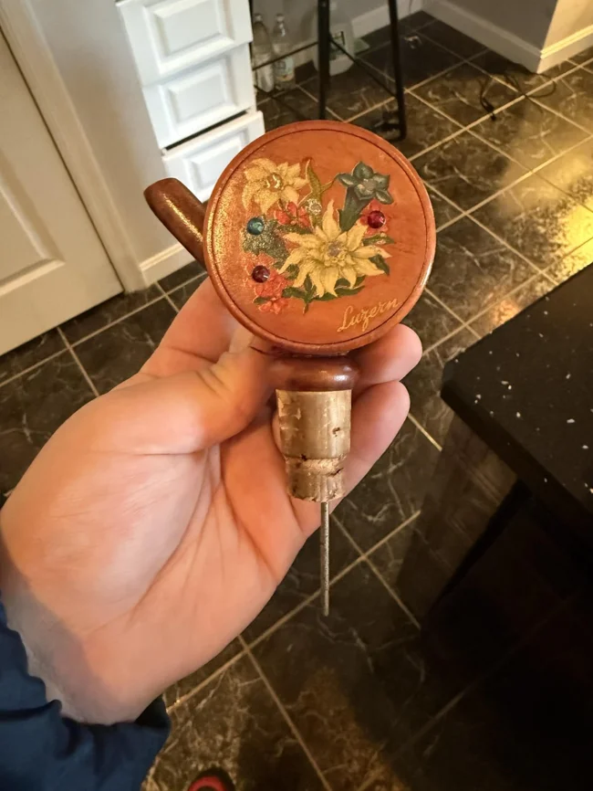 9. Металева штуковина з пробковою ручкою на кінці. Приблизно 20 сантиметрів завдовжки з поглибленням на кінці, яке, схоже, може щось вміщувати. Наконечник відгвинчується, і в нього можна щось помістити