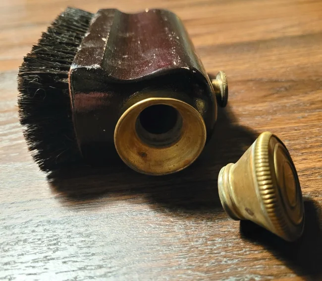 Це взуттєва щітка із вбудованим резервуаром для крему. Маленький латунний стрижень, вкручений збоку — це щось на зразок голчастого клапана для повільного нанесення крему.