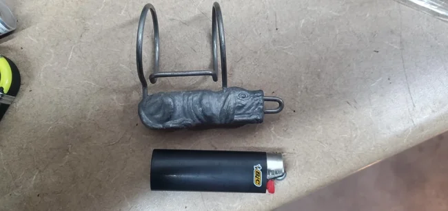 5. Що це за штука у формі собаки? Вона важка, можливо, зроблена зі свинцю, а зверху в неї два металеві кільця