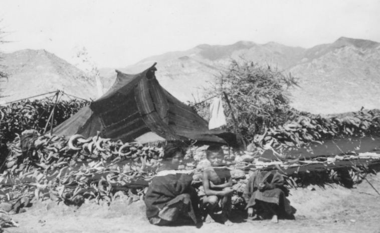 30. Тибетські жебраки сидять в очікуванні паломників біля священного шляху навколо Потали, стіна на фоні зроблена з рогів, 1944 рік