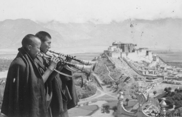 26. Буддійські ченці сурмлять у заклику до молитви, палац Потала на тлі, 1944 рік