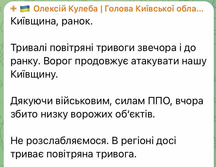 - Атаки на Київську область продовжуються, не залишайте укриттів, закликає голова ОВА Кулеба.