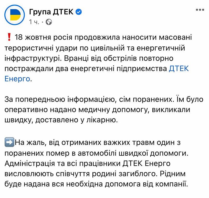 - Внаслідок ранкового обстрілу двох підприємств ДПЕК загинула 1 особа, ще 6 поранено.