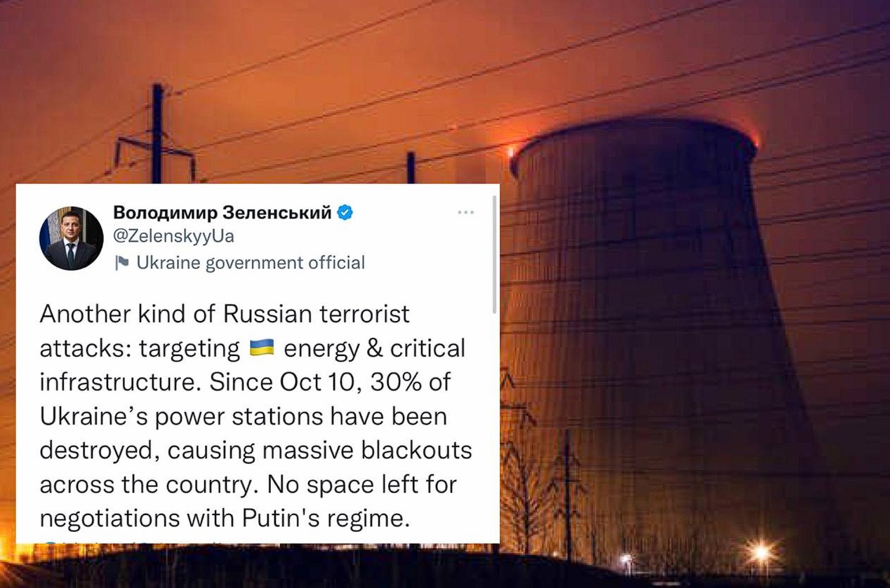 - Місця для переговорів із путінським режимом не залишилося: з 10 жовтня 30% українських електростанцій було зруйновано, заявив Володимир Зеленський. Удари Росії призвели до масових відключень електроенергії по всій країні.
