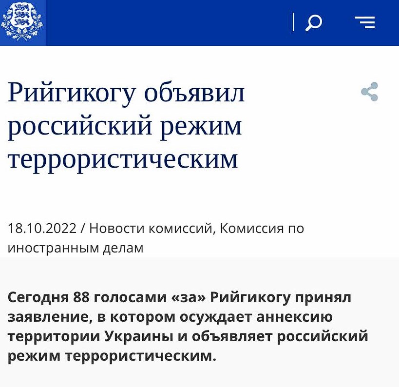 - Понеслося: парламент Естонії оголосив режим Росії терористичним, а саму Росію - державою. -Спонсором тероризму.