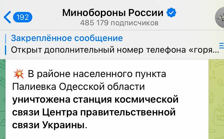 - Мінвбивства Росії повідомляє, що знищили станцію космічного зв'язку.