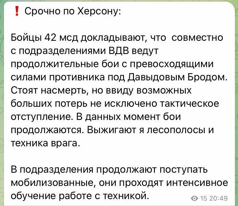 - Завтра на засіданні Радбезу у рішку можуть ввести військовий стан і повністю закрити кордони, повідомляють росЗМІ (https://verstka.media/zavtra-zasedanie-sovfeda-prodolzhitsya/).