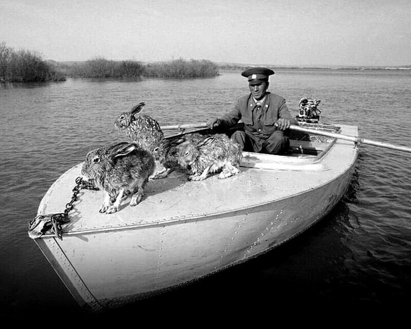 Єгер із врятованими зайцями під час повені в Башкирії, 1979 рік
