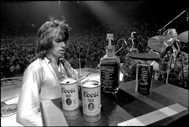 Кіт Річардс на сцені з віскі та пивом під час американського турне Rolling Stones, 1972. Фотограф Ітан Рассел