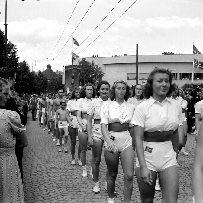 Парад на мультиспортивному стадіоні "Біслетт" у місті Осло, Норвегія, 3 червня 1945 року. Фотограф Рольф А. Стрьом