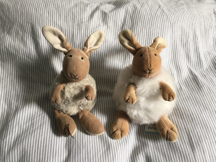 «Два мої плюшеві кролики. Вони обидва у мене з народження, тільки один був скрізь зі мною, а другий зберігався у шафі. Ось так вони виглядають через 22 роки»