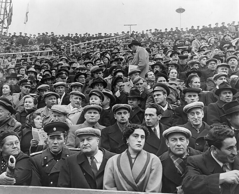 Глядачі футбольного матчу СРСР-Франція на стадіоні "Динамо", Москва, 23 жовтня 1955 року. Фотограф Жан-Філіп Шарбоньє