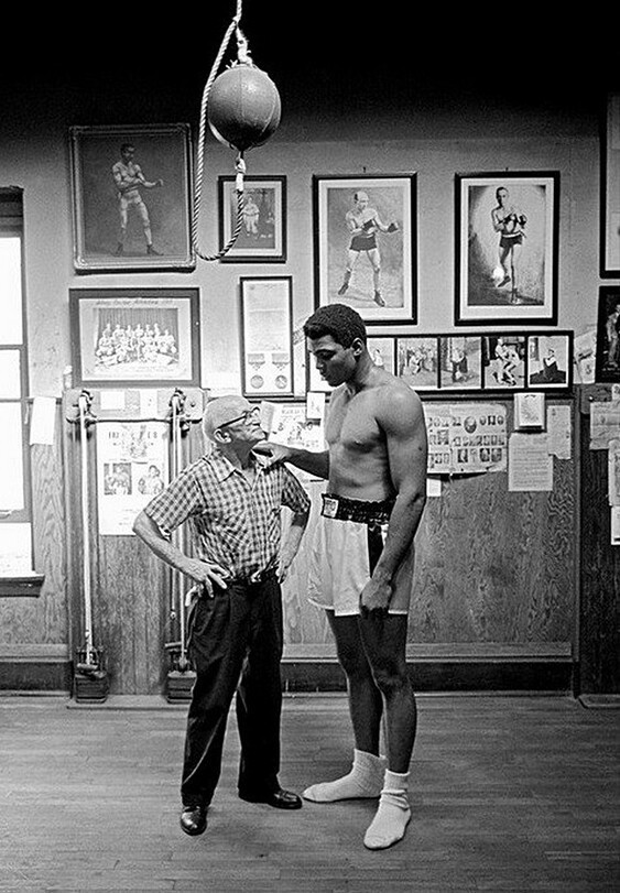 Мухаммед Алі, чемпіон світу з боксу у важкій вазі разом із Джонні Кулон, чемпіоном 1910 року, у своєму чиказькому спортзалі, Чикаго, Іллінойс, США, 1966 рік. Фотограф Томас Хепкер