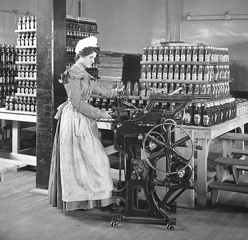 Працівниця, що розливає кетчуп по пляшках на оригінальній фабриці Heinz, близько 1897 року
