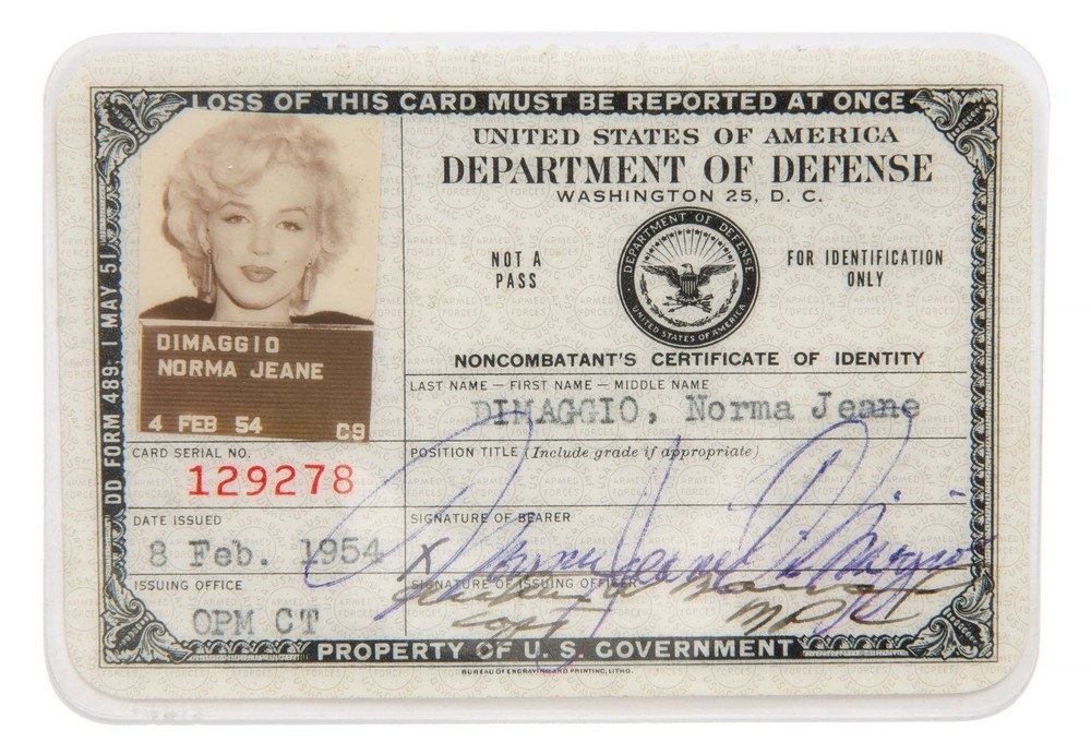 16. Посвідчення особи Норми Джин ДіМаджіо (вона ж Мерилін Монро) для Пентагону