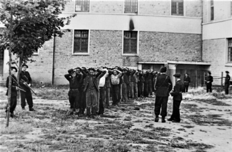 Французька міліція охороняє заарештованих, підозрюваних у причетності до партизан. Французька держава. 1944 рік