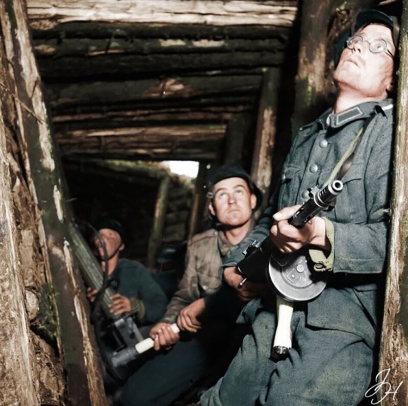 Фінські солдати в одному з укриттів лінії Ваммелсуу-Тайпале ховаються від нальоту радянської авіації, Фінляндія, 16 червня 1944 року