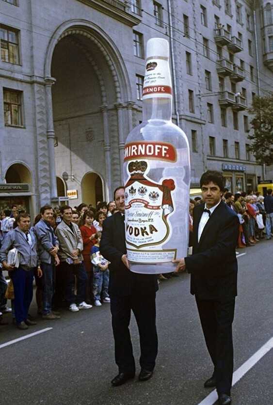 Хода з надувною пляшкою горілки «Smirnoff» Тверською вулицею. 24 липня 1990 року в СРСР скасували "сухий закон"